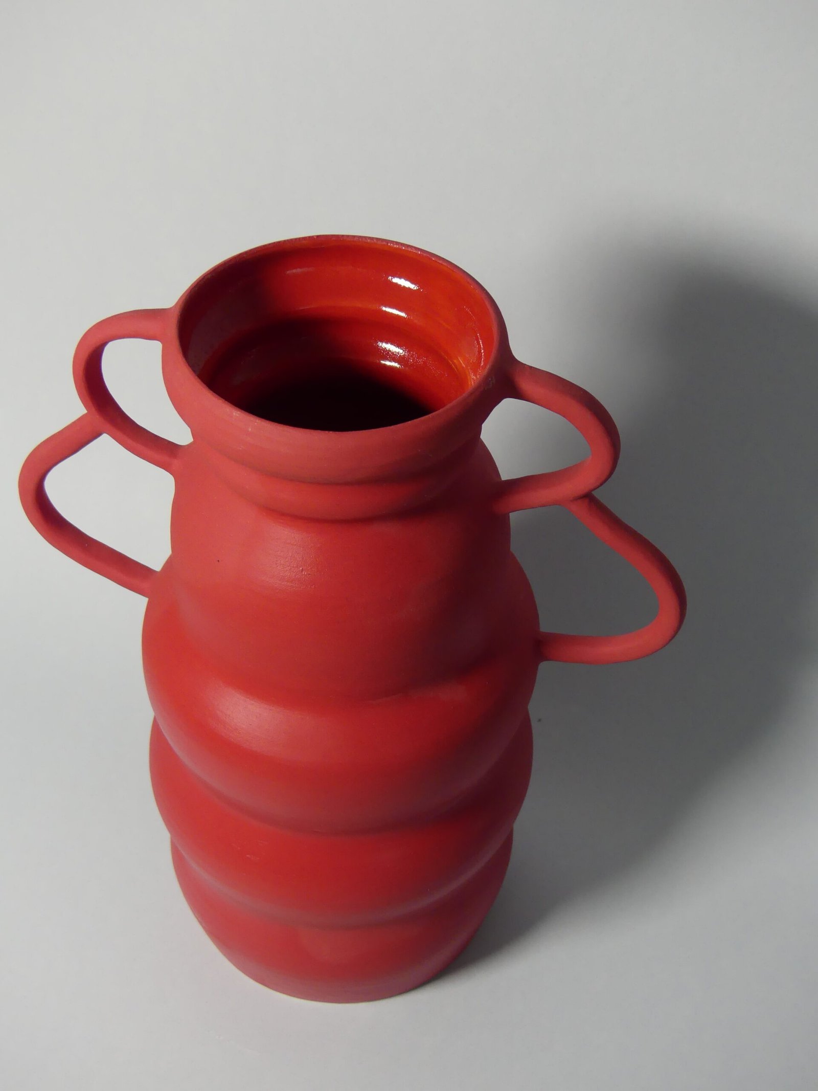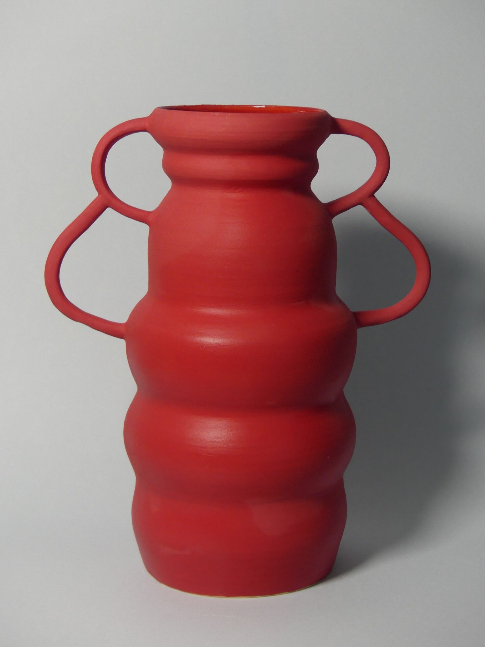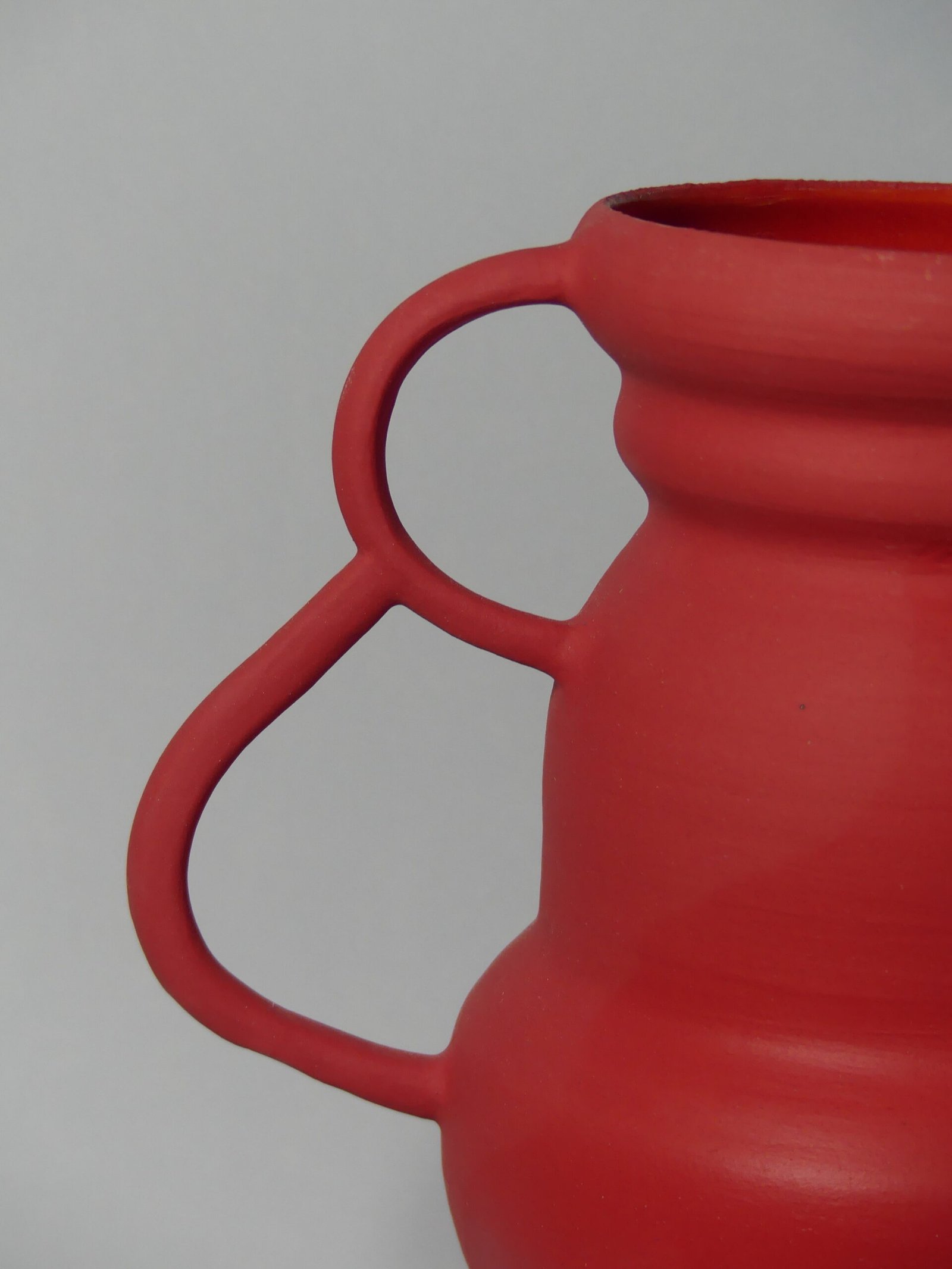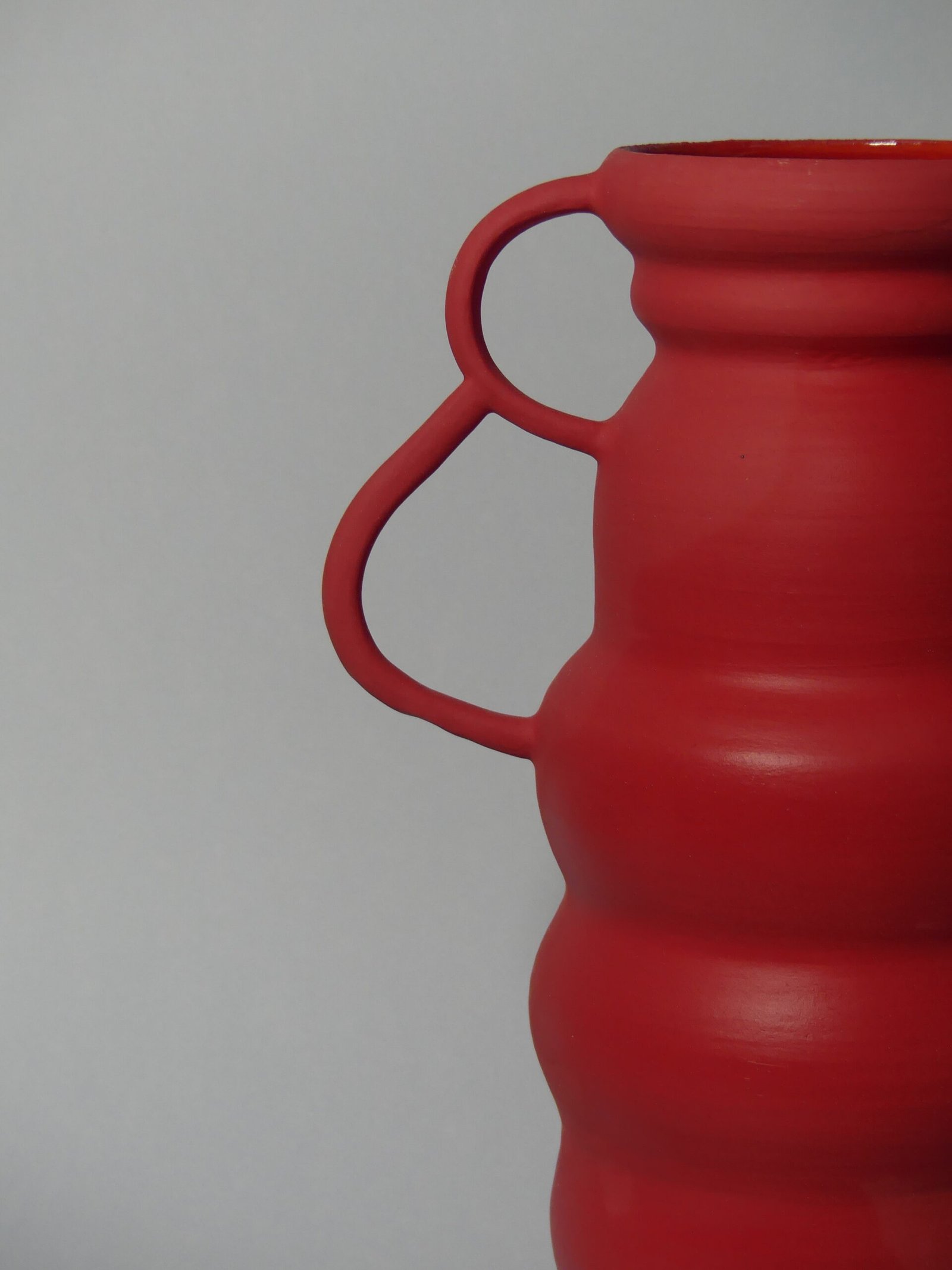 Wyrazisty, czerwony wazon o matowym wykończeniu to połączenie nowoczesnego designu i artystycznego charakteru. Jego nietypowe, intrygujące uszy nadają mu unikalną formę, która przyciąga wzrok i dodaje wnętrzu energii. Wykonany z wysokiej jakości ceramiki, stanowi wyjątkową ozdobę – zarówno z bukietem kwiatów, jak i jako samodzielny element dekoracyjny.